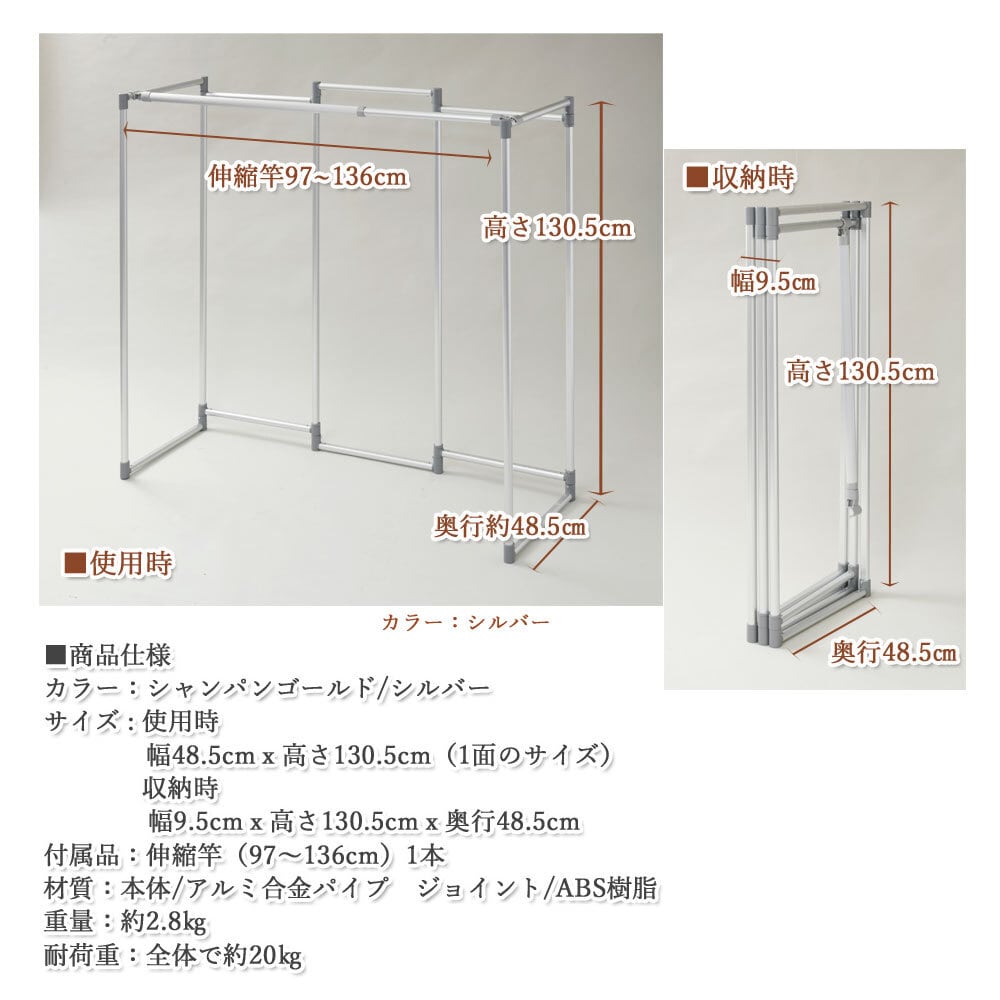 軽量シンプル物干し 伸縮竿付き(5連タイプ)アルミ製 幅48.5x高さ130.5cm(1面のサイズ)パイプ 洗濯物 部屋干し 省スペース 折りたたみ 伸縮 縦横伸縮 大容量 軽い 新生活 一人暮らし