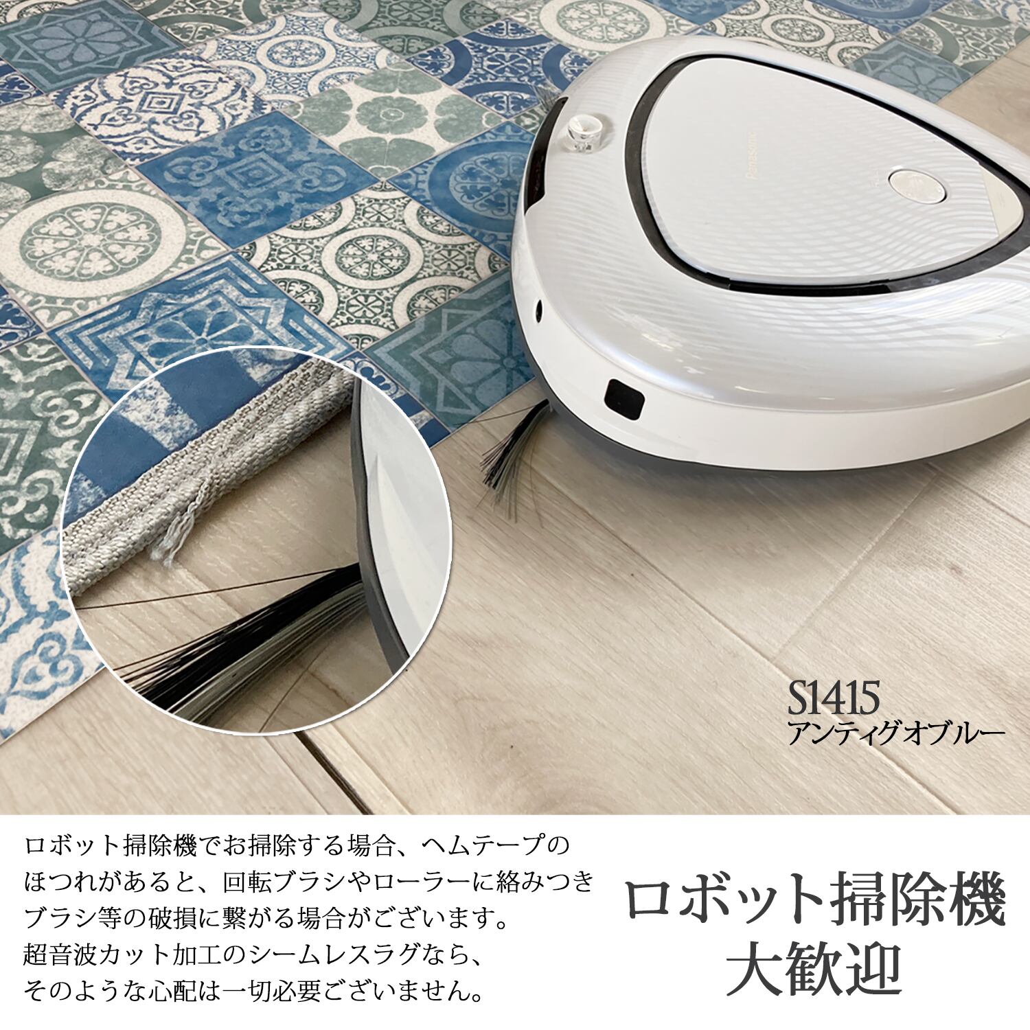 ・縫い目が無く、見た目すっきりの段差のないシームレスだから、段差がなく、縁取りヘムをペットが引っ張ったり、ロボット掃除機が巻き込む等のトラブルがありません。