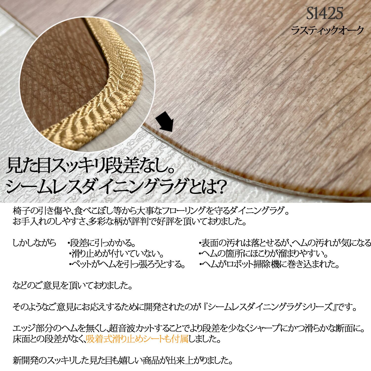 ・縫い目が無く、見た目すっきりの段差のないシームレスだから、段差がなく、縁取りヘムをペットが引っ張ったり、ロボット掃除機が巻き込む等のトラブルがありません。